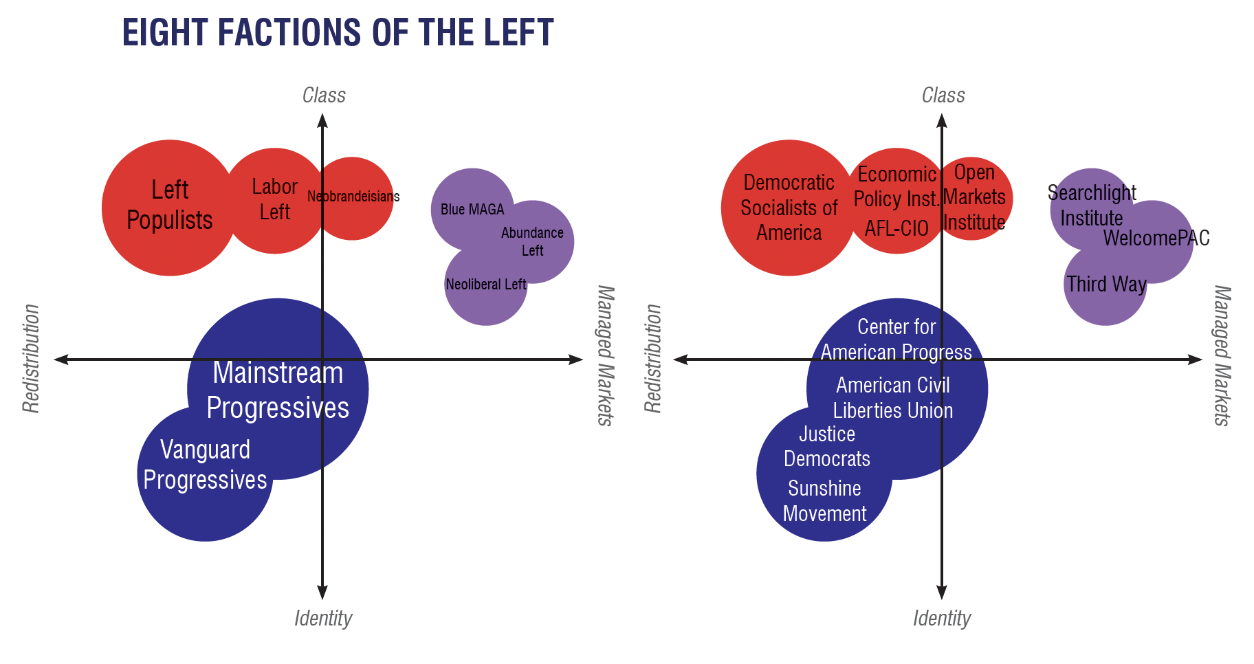 The Class Populists and Center-Left agree that a successful politics must focus on the working class. They disagree, however, on whether to achieve their goals by government compulsion or market-friendly means respectively. While the Class Populists and the Progressives broadly agree on redistribution, they disagree on whether this should occur along identitarian or class lines. As a result, these three blocs hold uneasily reconciled positions. Resolution of this divide will define the party’s future; two of the blocs must reach a power-sharing settlement. Understanding how the intra-Left stalemate will resolve requires mapping the eight factions of the American Left that compose the larger three blocs described above:
